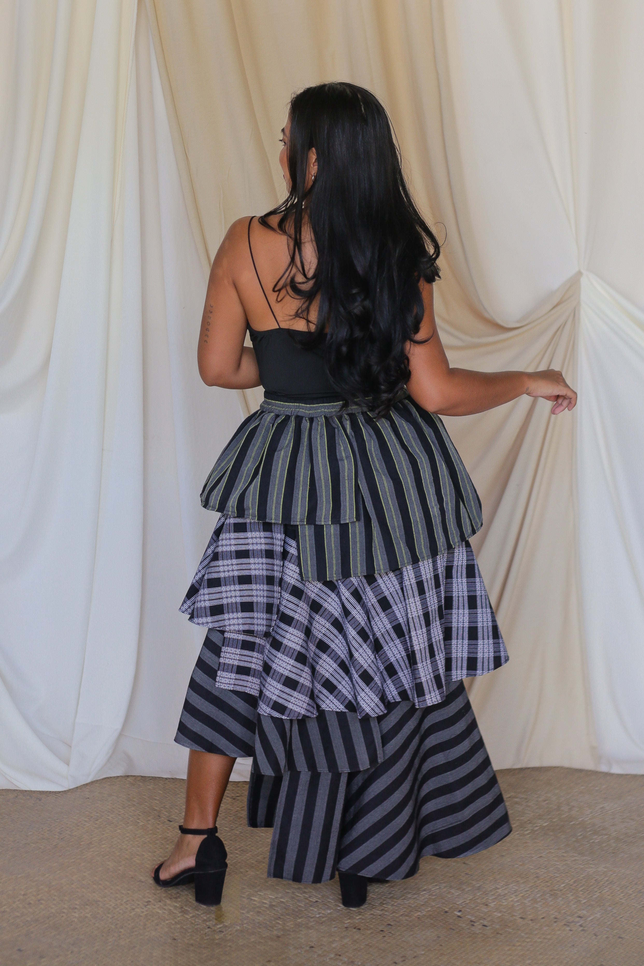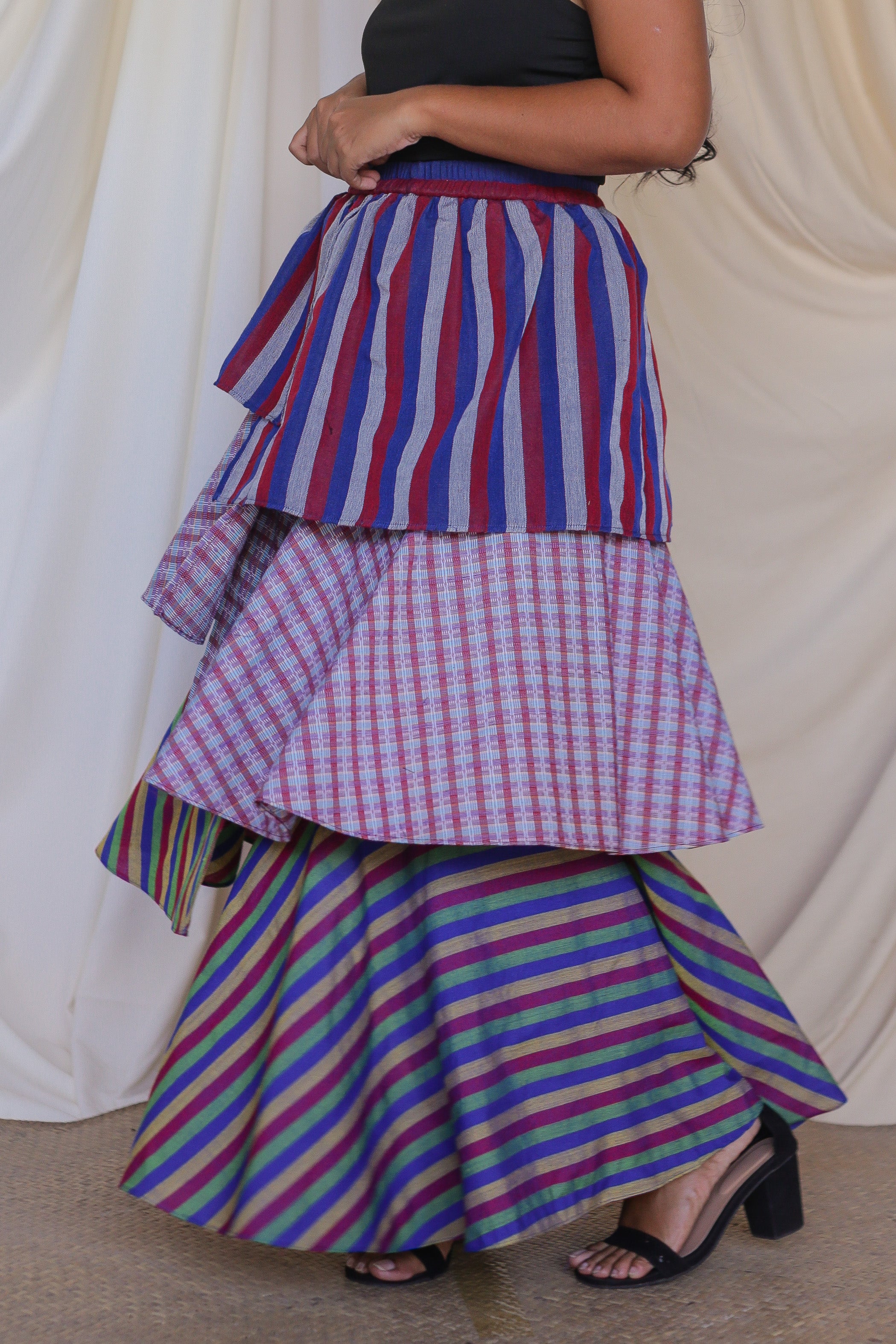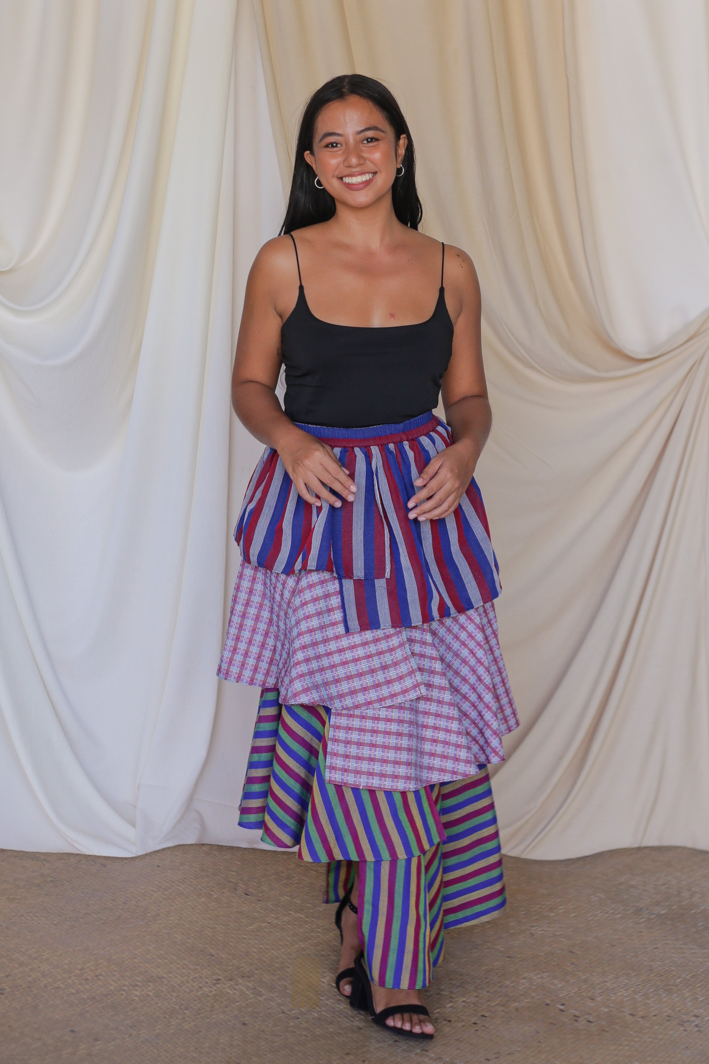 The Loro Hagdan is a playful reinvention of the beloved Loro Skirt, featuring layers of handwoven Filipino fabrics like Binakol, Kantarines, and Hablon. With the final tier cut in asymmetrical lengths, this skirt adds depth and flair while staying true to its twirl-worthy charm. It’s a celebration of tradition and color, blending textures and patterns to create a dynamic, one-of-a-kind look that’s ready to mo9ve with you.