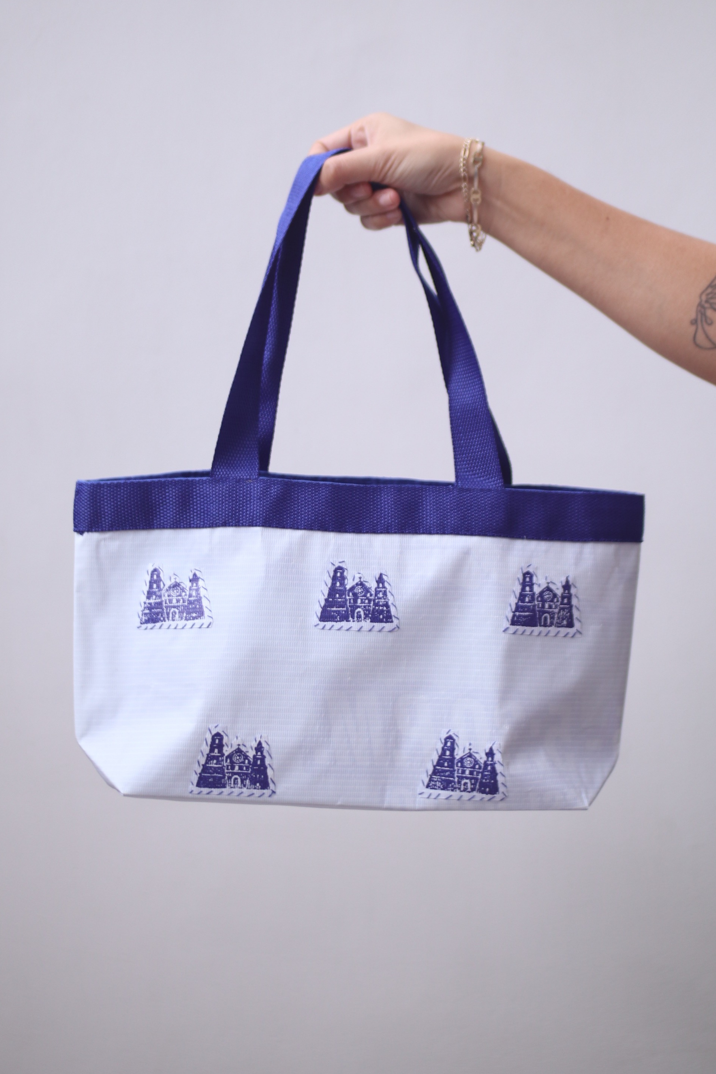 This tote is made from upcycled tarpaulins—post-election banners and old campaign materials transformed into something useful and lasting. Each piece is block-printed with Iloilo icons like Miagao Church, sugarcane, and pineapple—a reminder that when waste is reclaimed, value is re-woven back into communities.