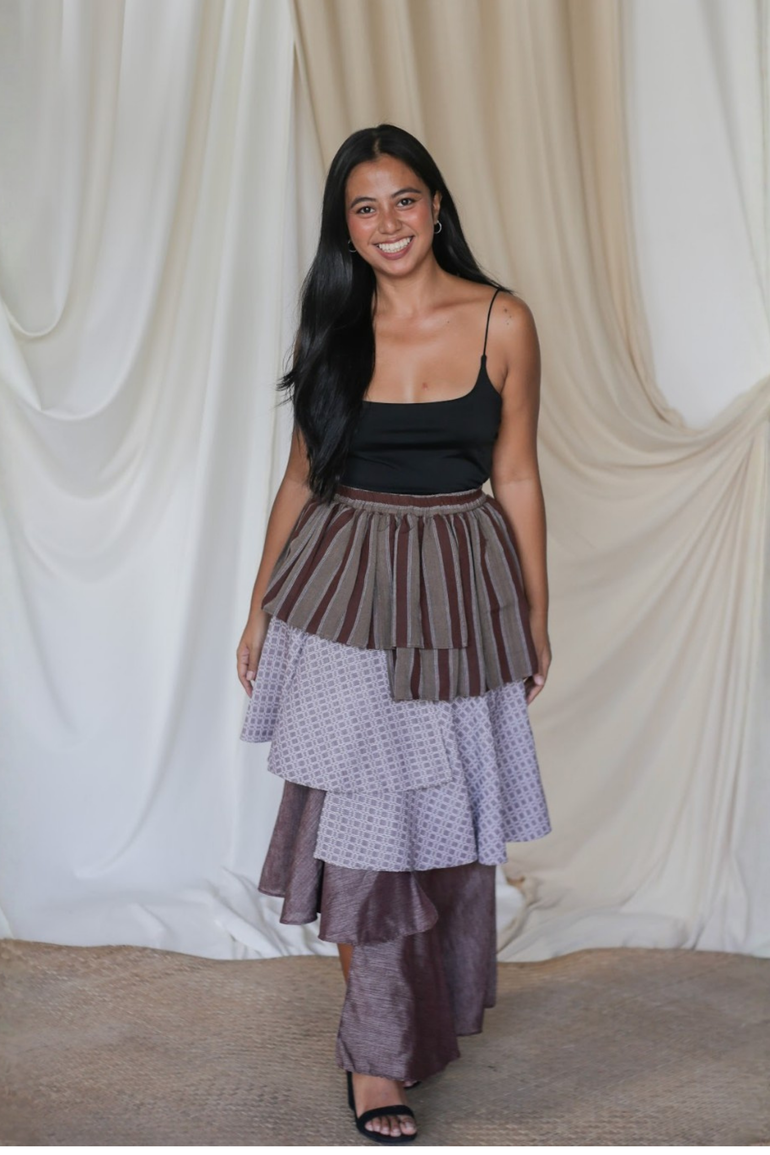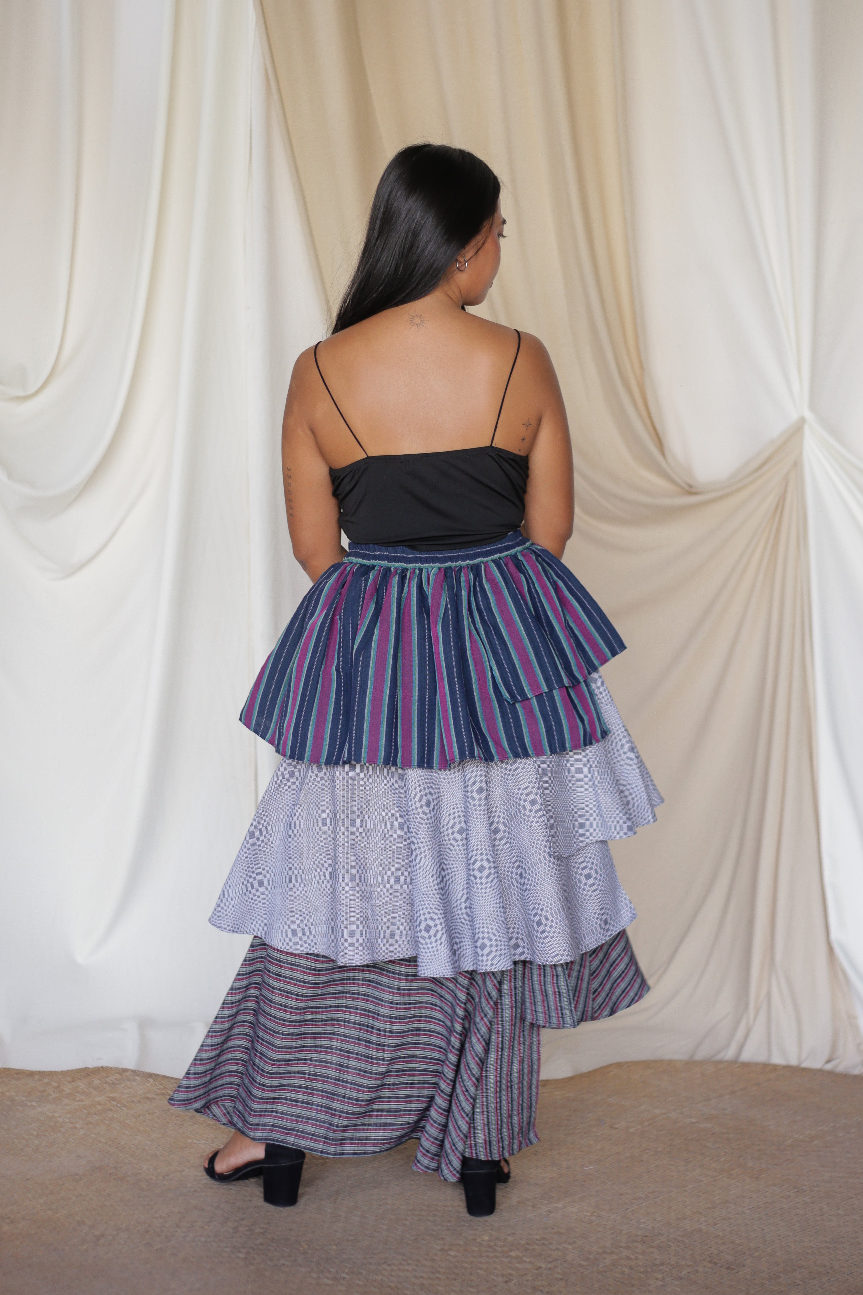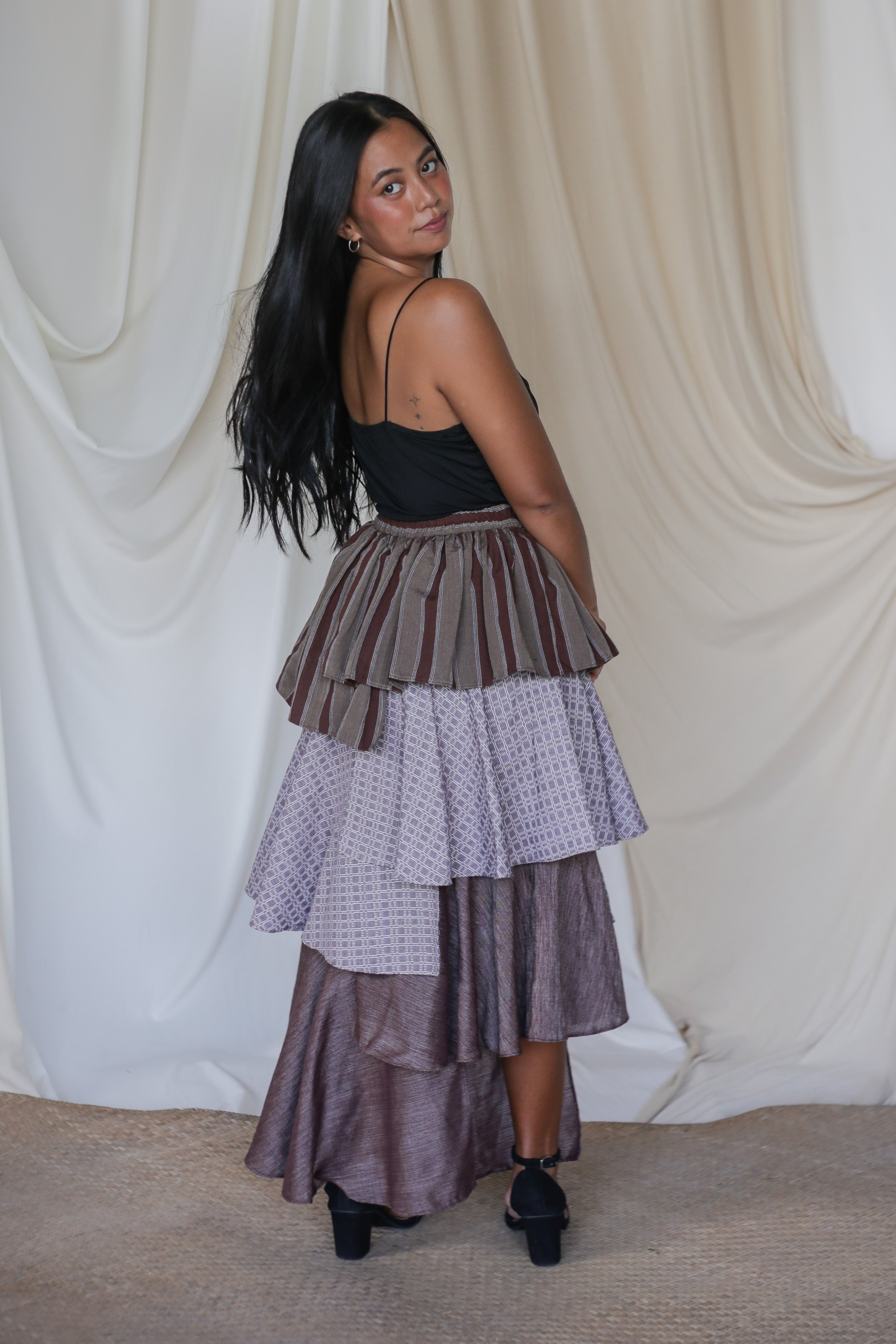 The Loro Hagdan is a playful reinvention of the beloved Loro Skirt, featuring layers of handwoven Filipino fabrics like Binakol, Kantarines, and Hablon. With the final tier cut in asymmetrical lengths, this skirt adds depth and flair while staying true to its twirl-worthy charm. It’s a celebration of tradition and color, blending textures and patterns to create a dynamic, one-of-a-kind look that’s ready to move with you.