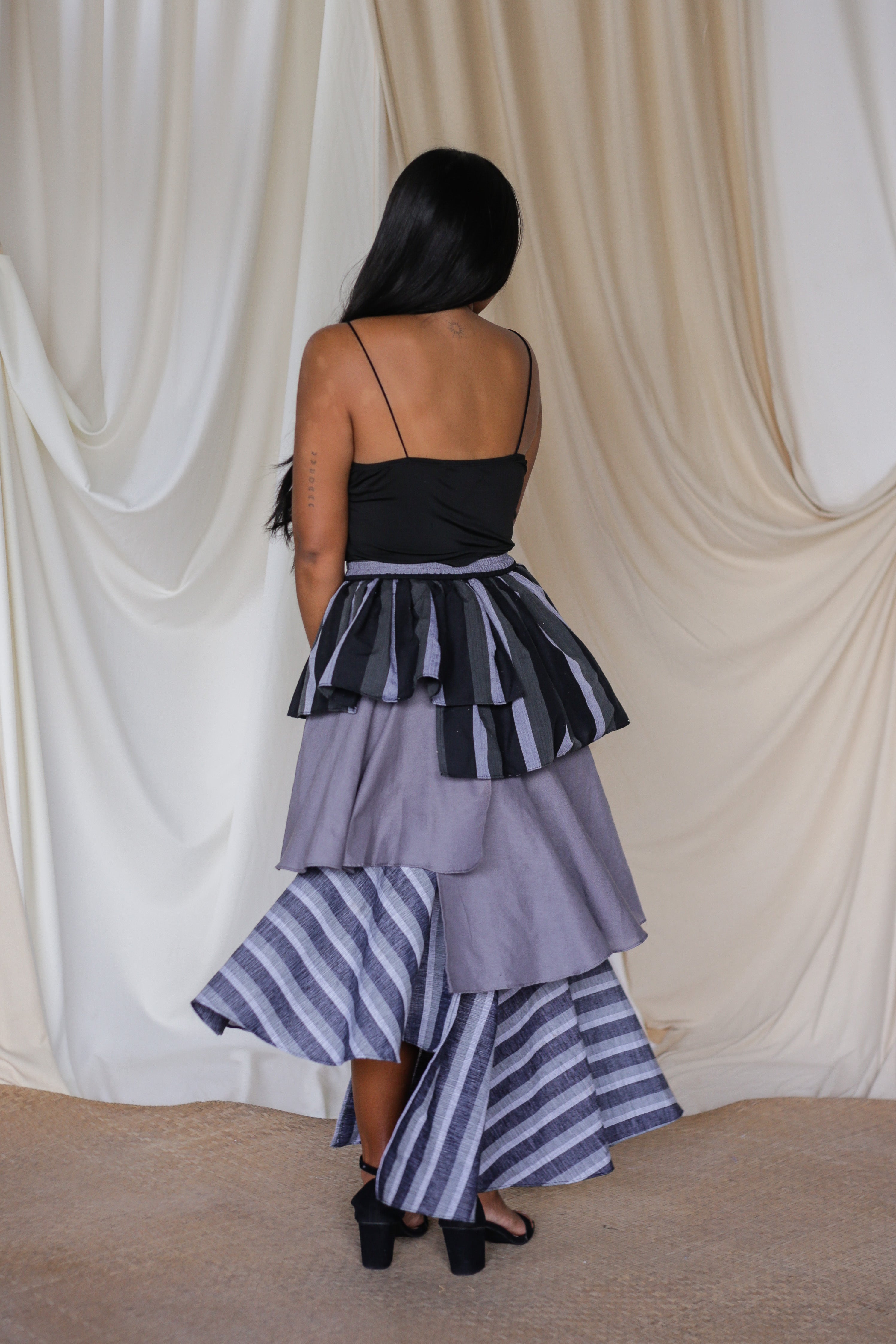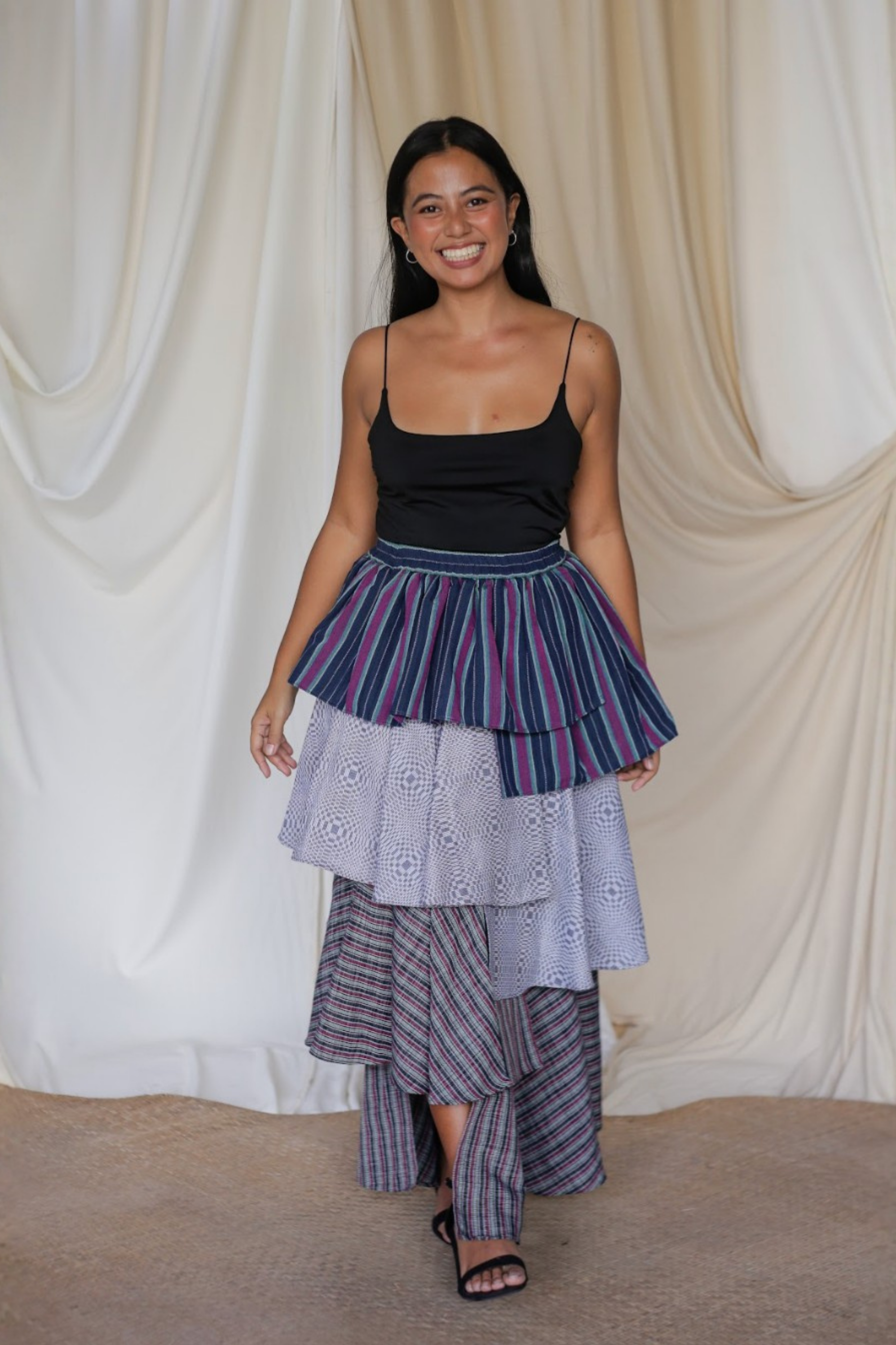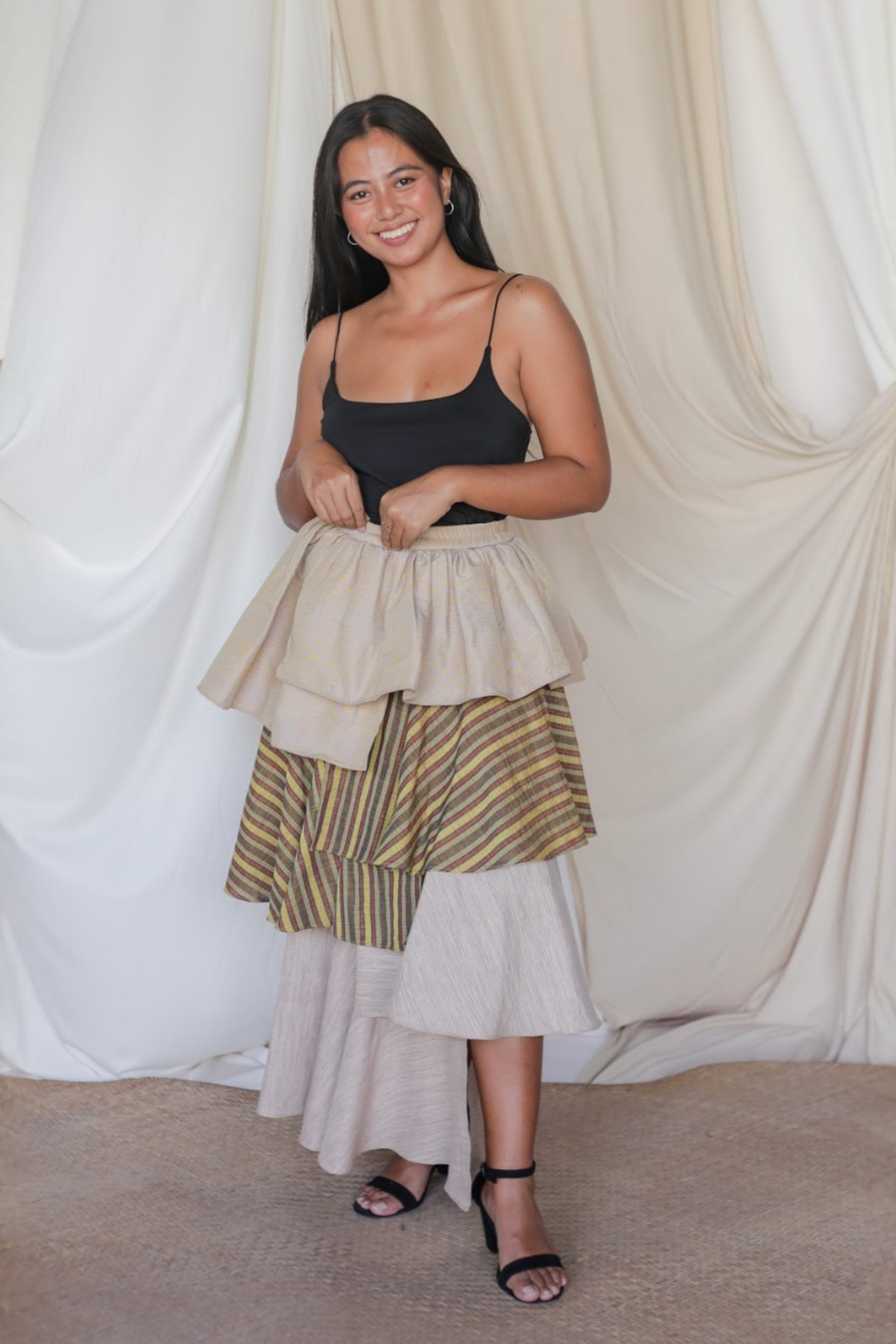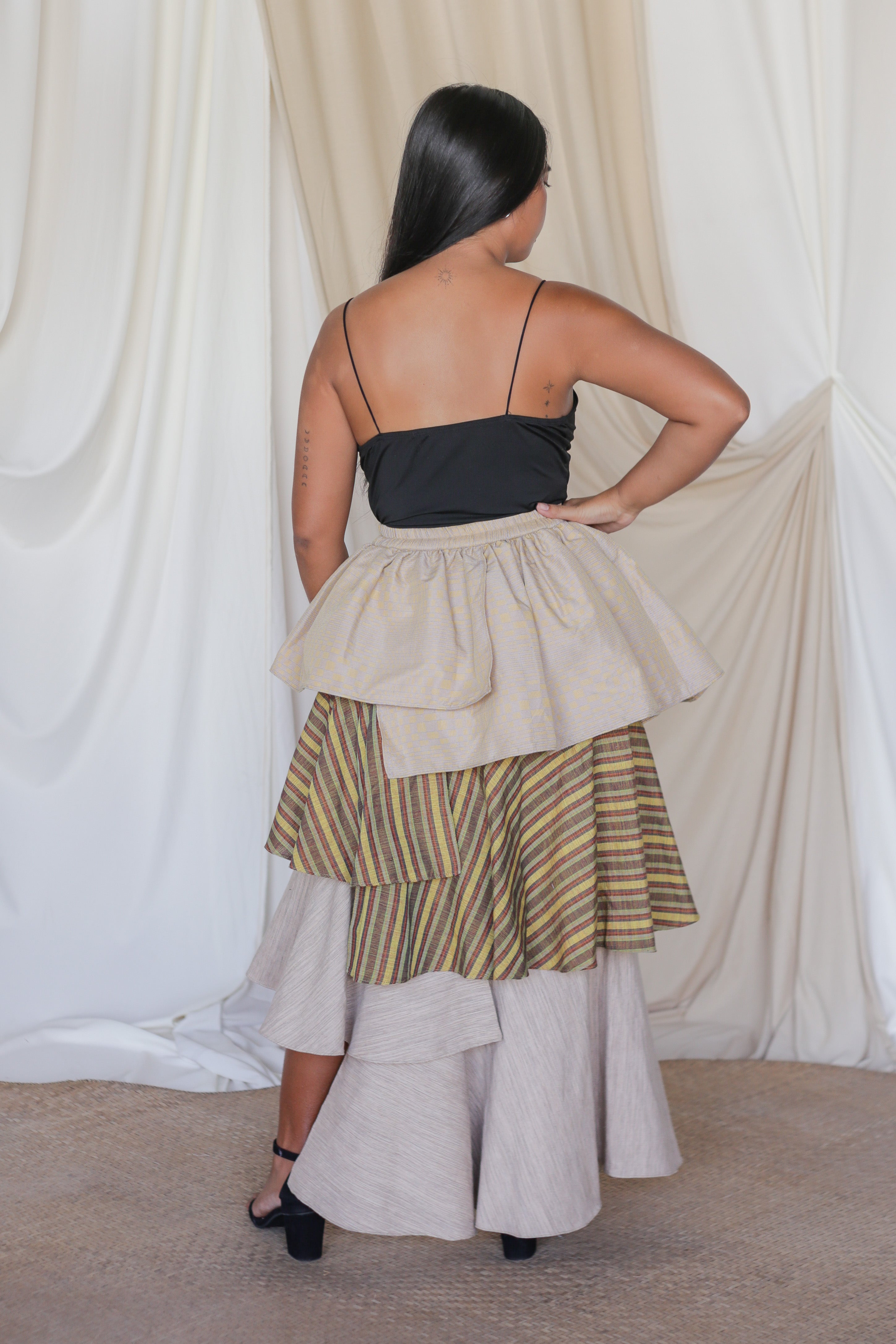 The Loro Hagdan is a playful reinvention of the beloved Loro Skirt, featuring layers of handwoven Filipino fabrics like Binakol, Kantarines, and Hablon. With the final tier cut in asymmetrical lengths, this skirt adds depth and flair while staying true to its twirl-worthy charm. It’s a celebration of tradition and color, blending textures and patterns to create a dynamic, one-of-a-kind look that’s ready to move with you.