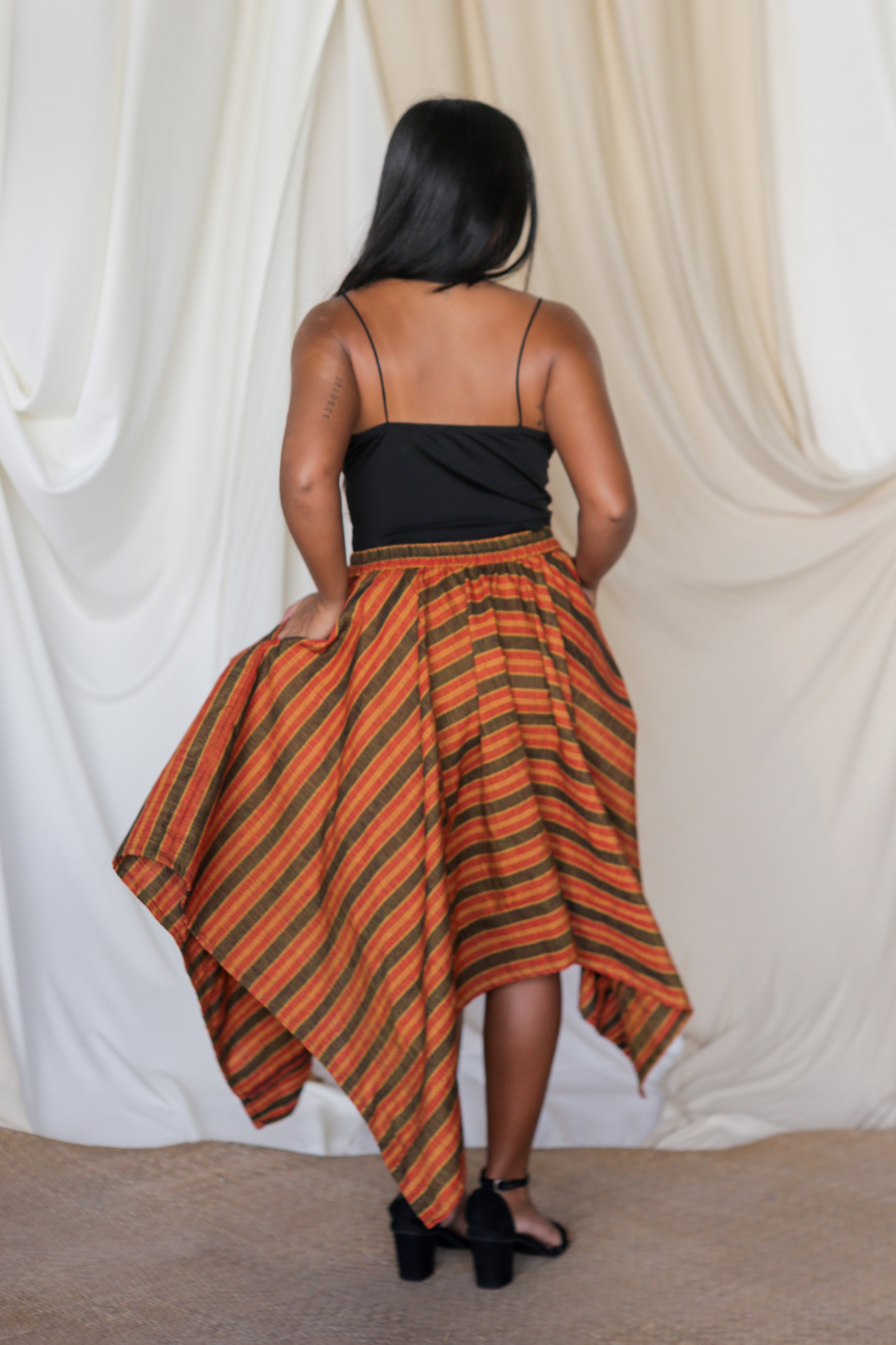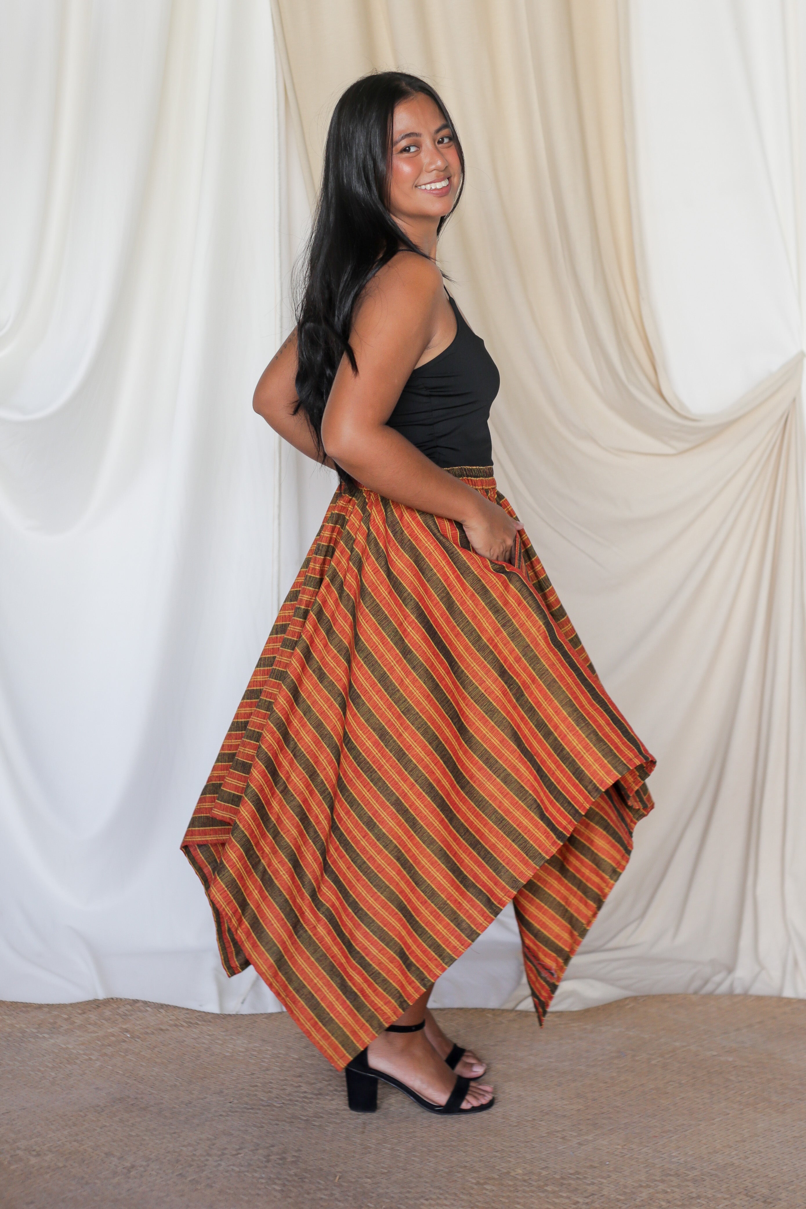 The Panyo Midi strikes the perfect balance between playful and polished. With its flowing silhouette and signature asymmetrical hem, this mid-length beauty moves effortlessly with you. Made with soft heartwoven fabrics, it’s a versatile staple—graceful enough for special moments, yet comfortable for everyday twirls.
