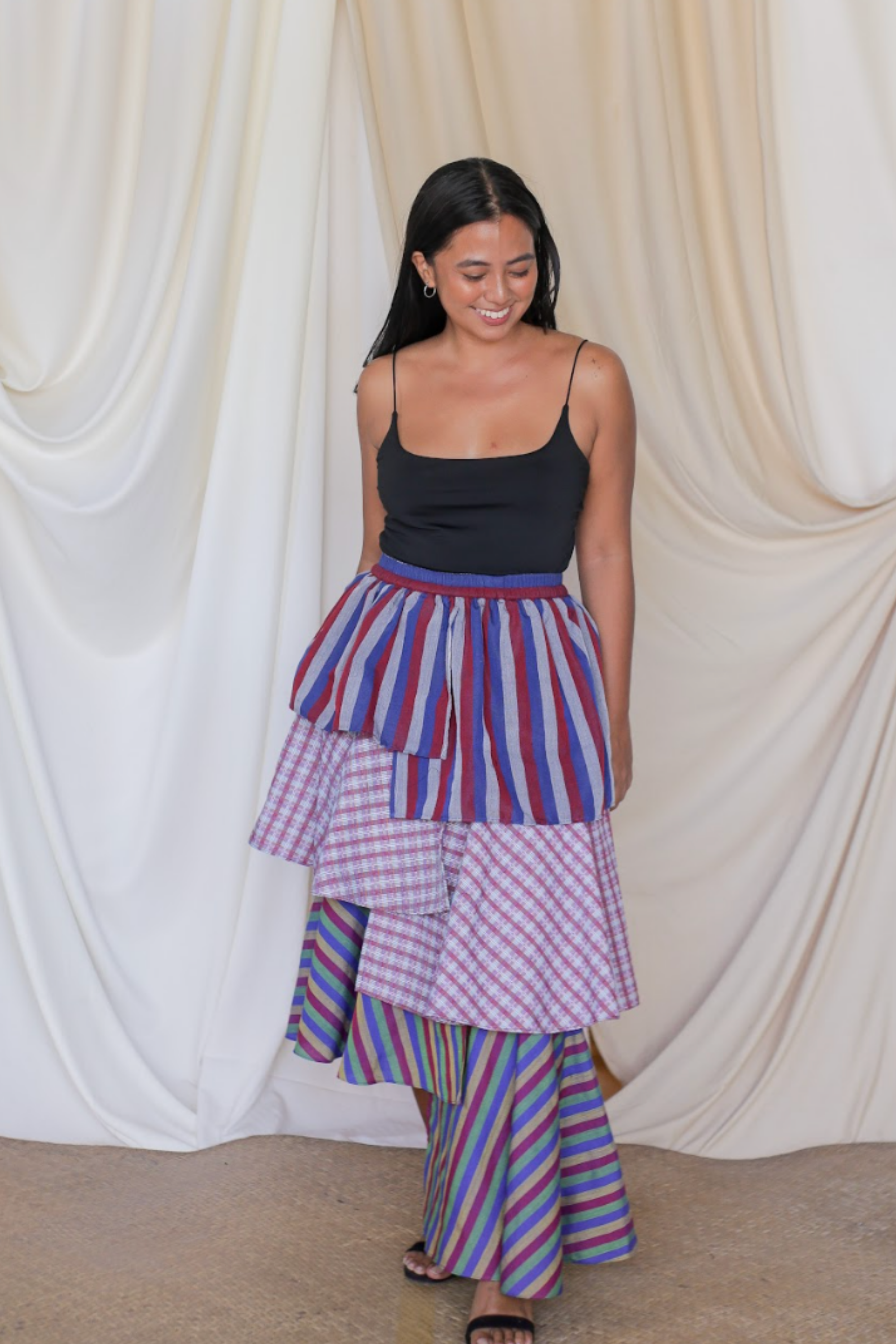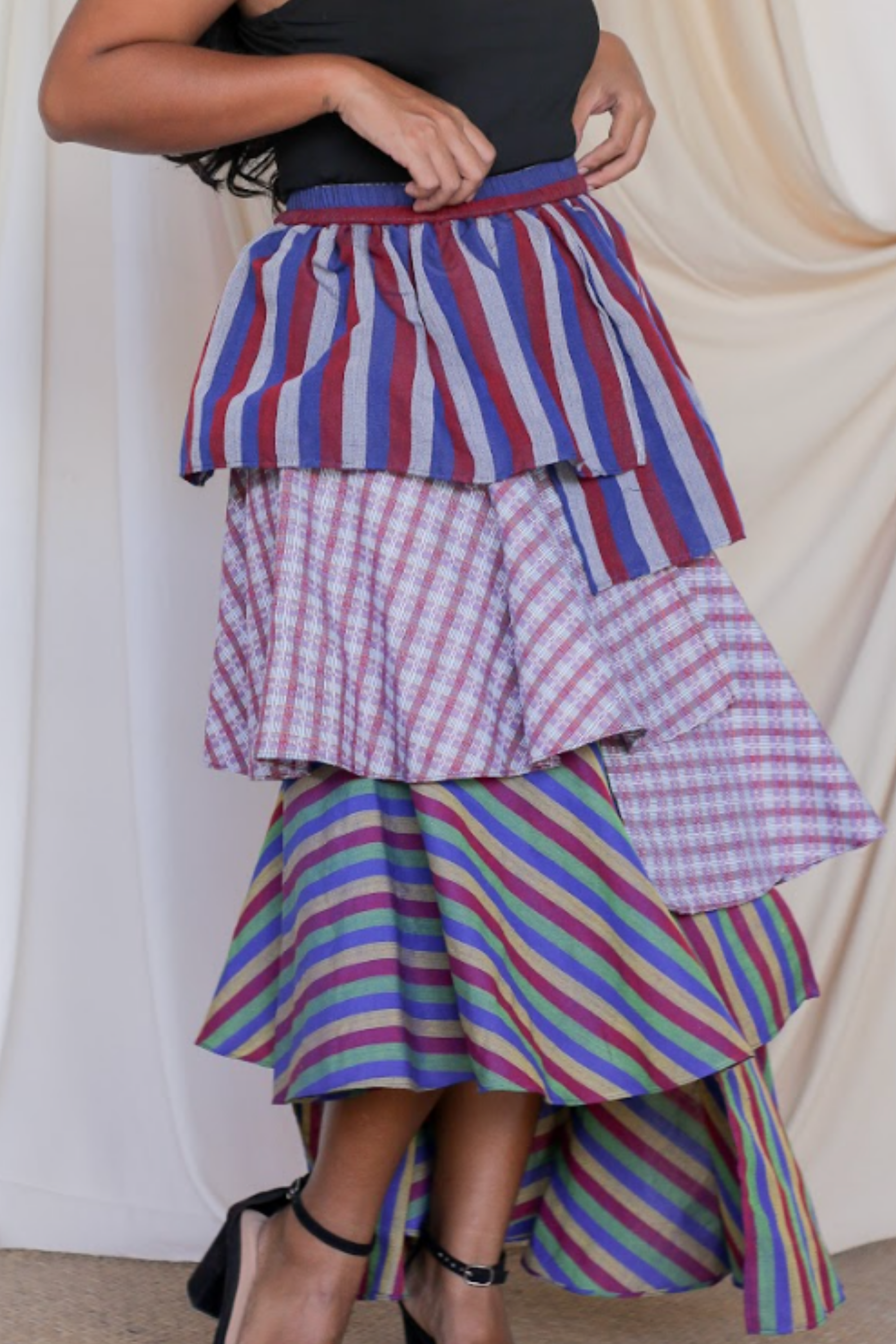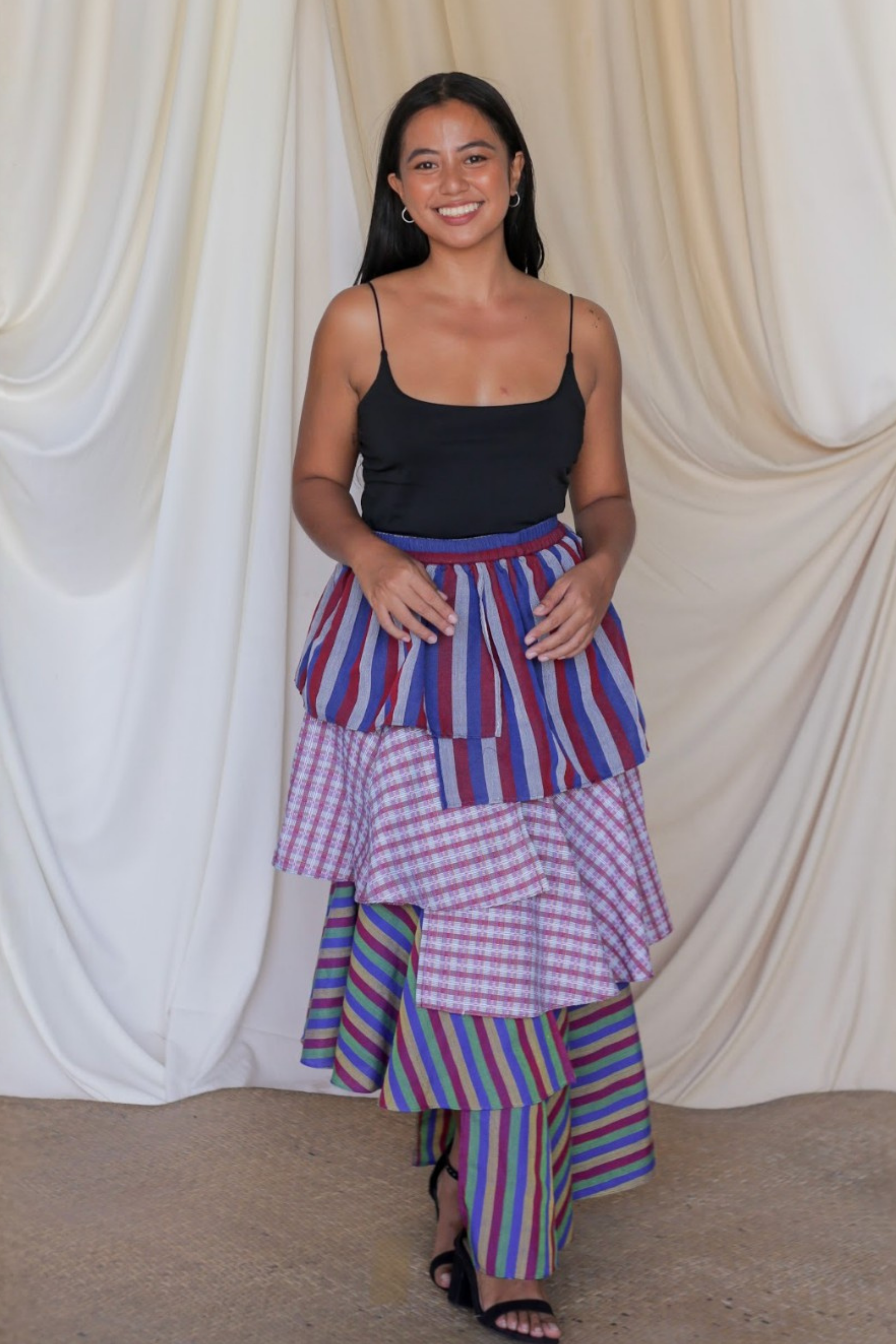 The Loro Hagdan is a playful reinvention of the beloved Loro Skirt, featuring layers of handwoven Filipino fabrics like Binakol, Kantarines, and Hablon. With the final tier cut in asymmetrical lengths, this skirt adds depth and flair while staying true to its twirl-worthy charm. It’s a celebration of tradition and color, blending textures and patterns to create a dynamic, one-of-a-kind look that’s ready to mo9ve with you.