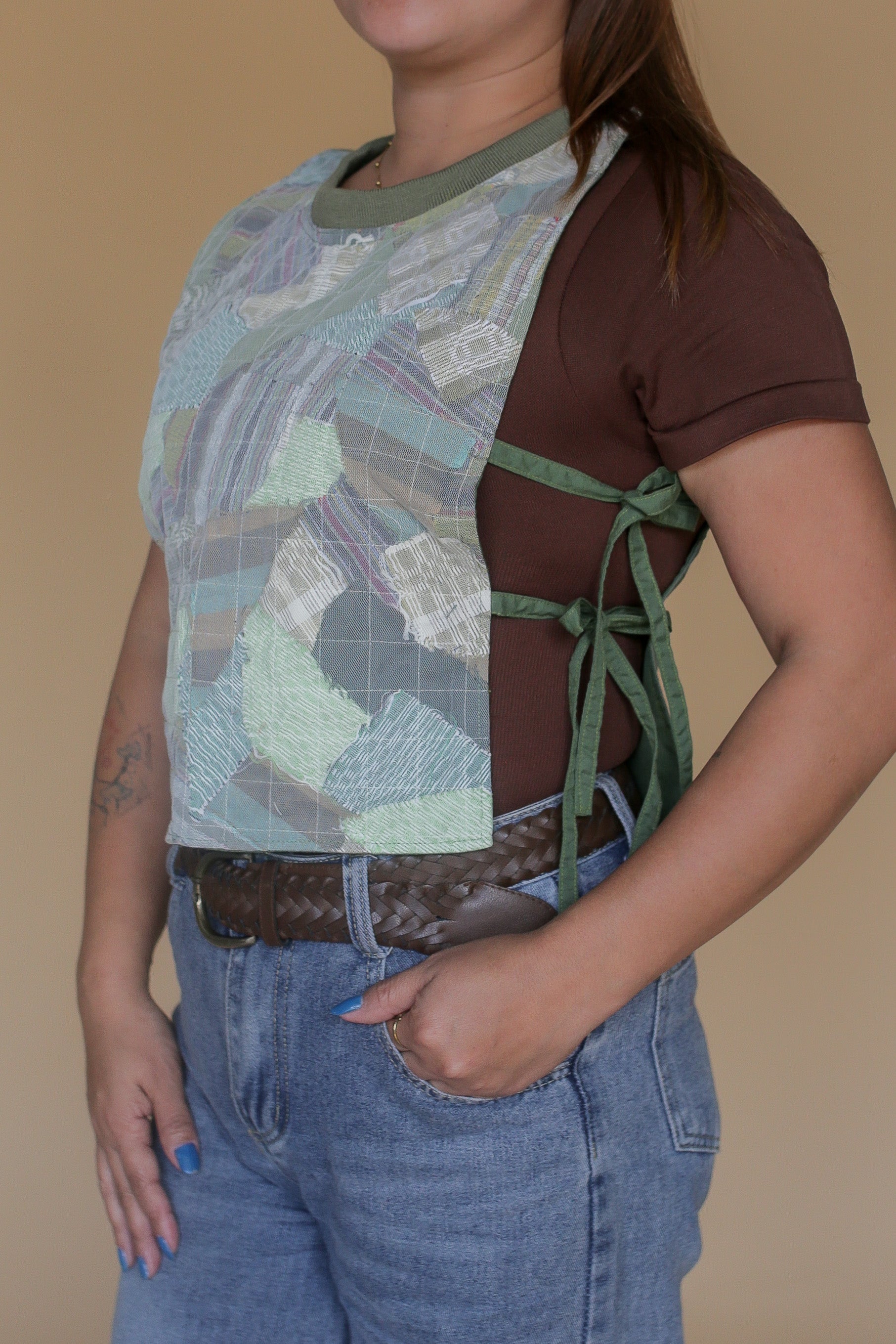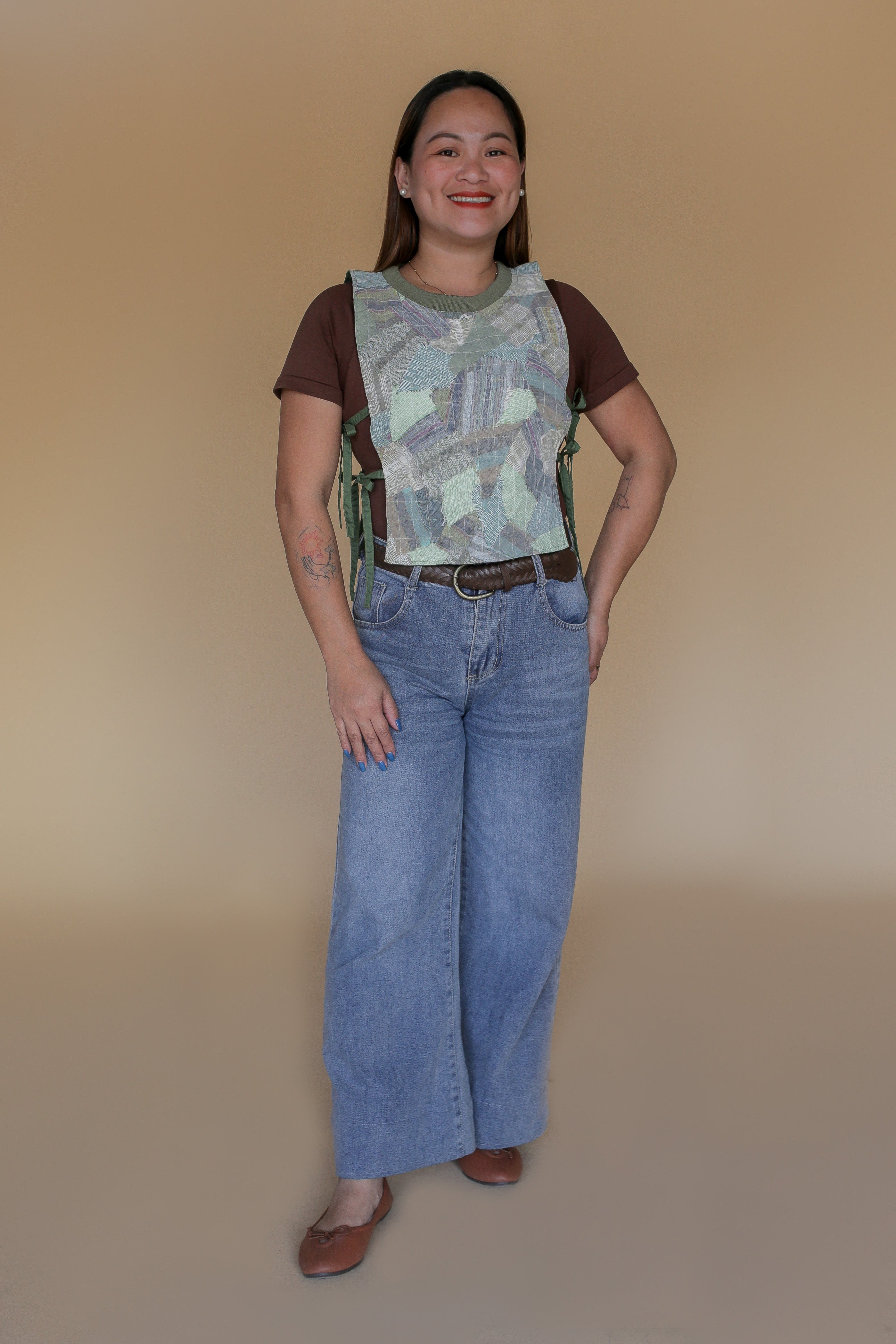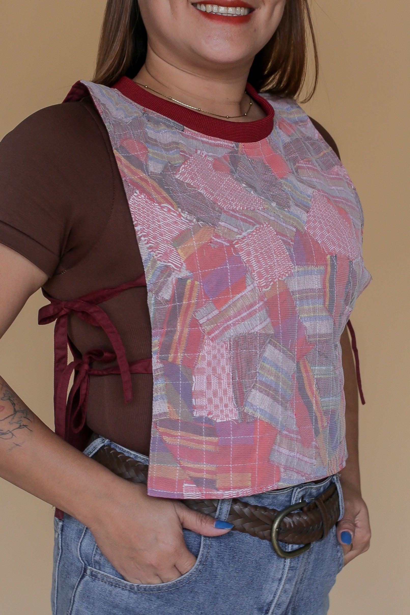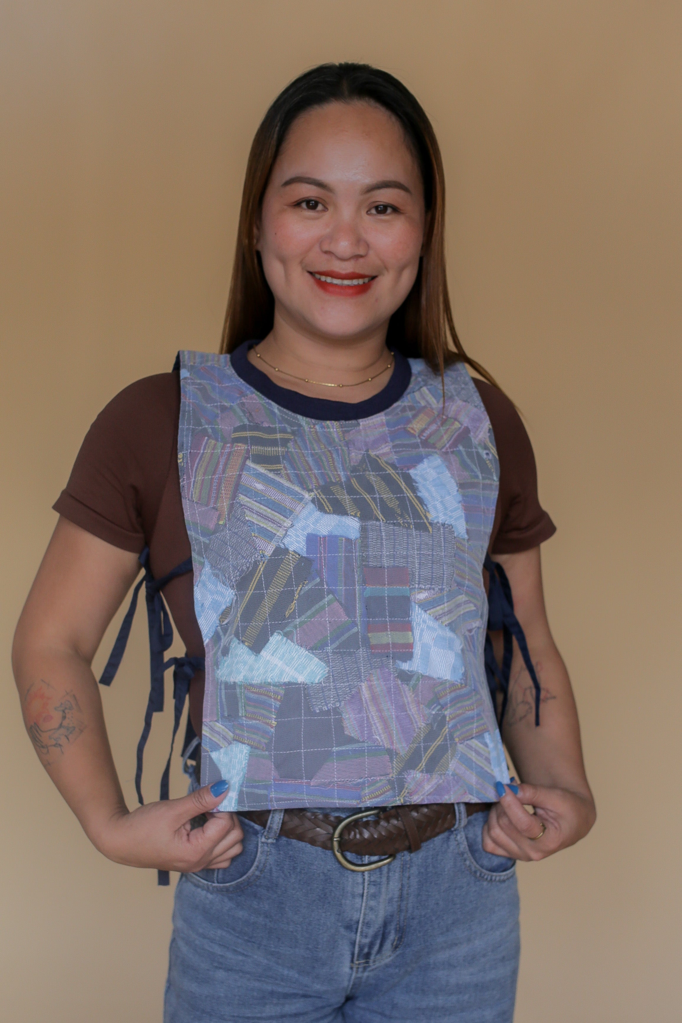 Bring individuality into your everyday with the Panolong Bib, an accent piece rooted in craft and circularity. Made from handwoven fabric scraps, each bib is stitched together using our signature sandwich technique, creating a layered composition that mirrors the look of a printed design. No two pieces are ever alike, making each one a truly one-of-a-kind expression. Lightweight yet striking, the Panolong Bib adds character and depth to any outfit. This easy statement piece carries the spirit of upcycling and the beauty of Filipino craftsmanship in every detail.