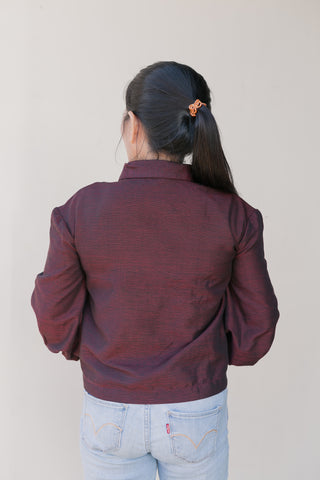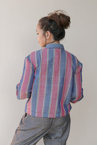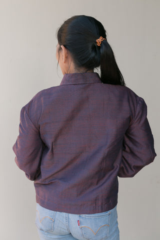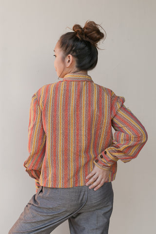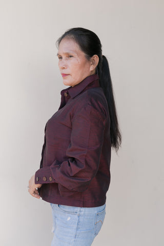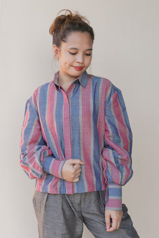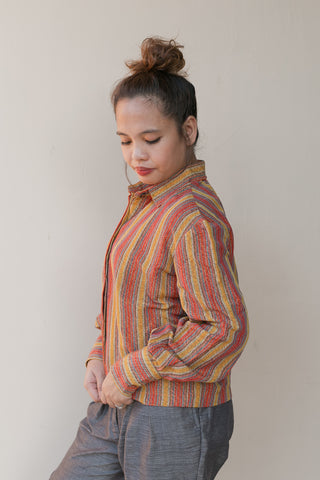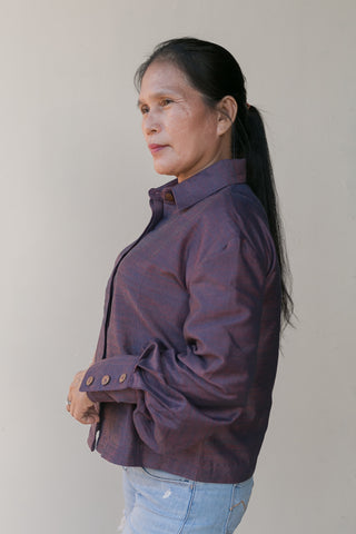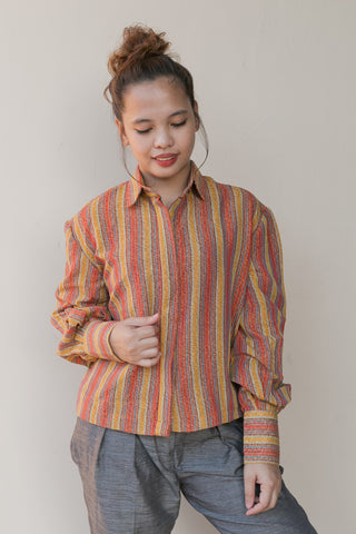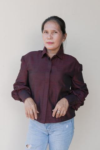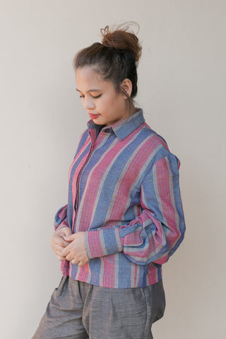 The Landrina blouse is a statement piece with its unconventional thick cuffs and puff sleeves, looking like the leaves of the same plant. The fabric comes the skillful hands of our community partner weavers in Abra and Argao.